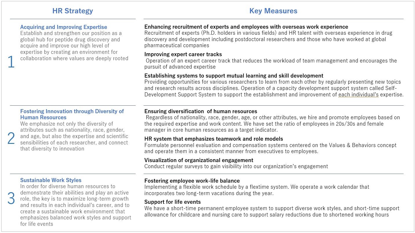 In order to enhance corporate value, PeptiDream is promoting three human resource strategies: “Acquiring and Improving Expertise,” “Fostering Innovation through Diversity of Human Resources,” and “Sustainable Work Styles based on the Valued Behaviors.”
