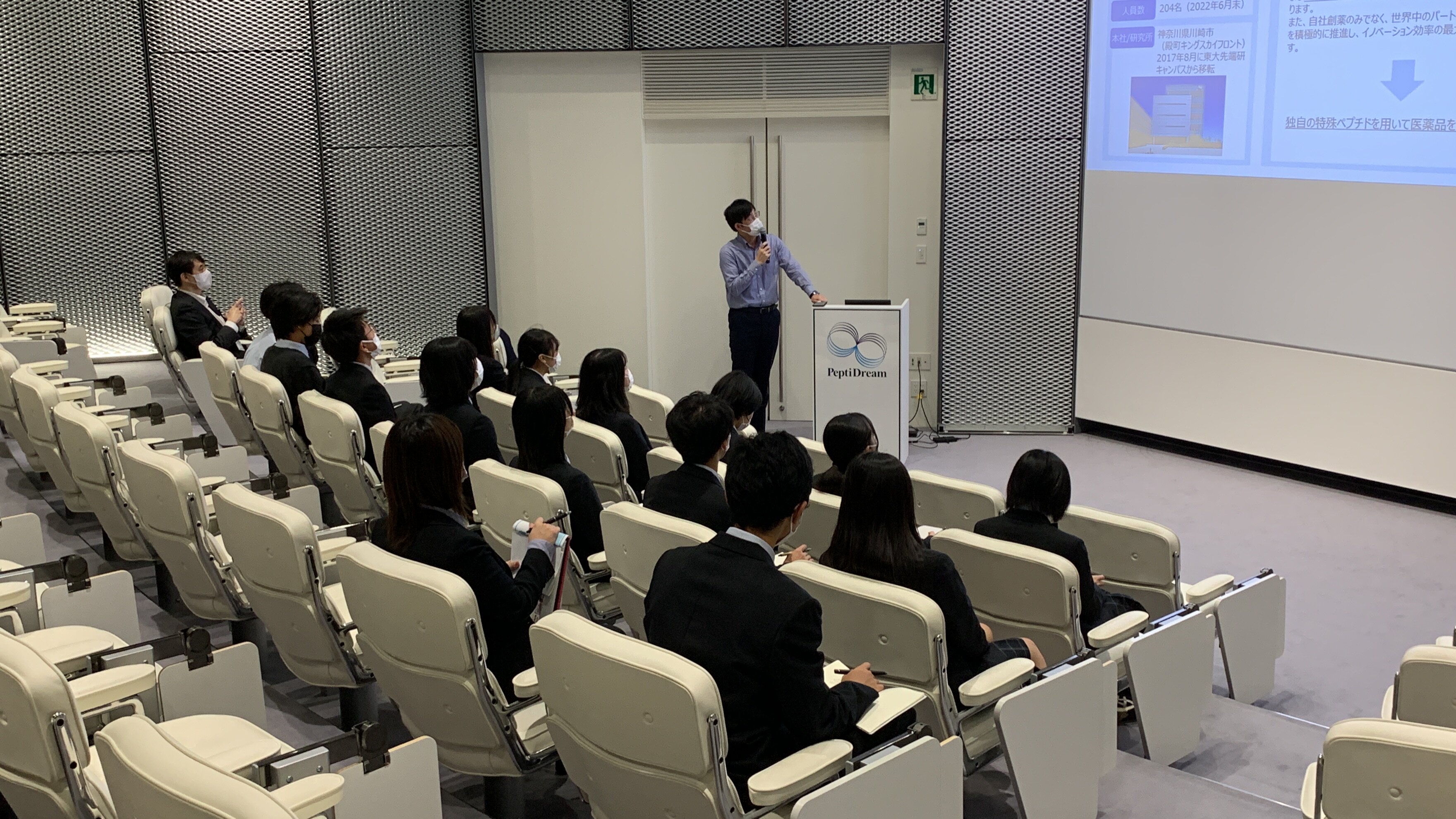In October 2022, 30 high school students visited PeptiDream as part of a hands-on learning program. By explaining our business activities and introducing the careers of our employees, especially researchers , we encouraged them to have a future image of working in a company. |