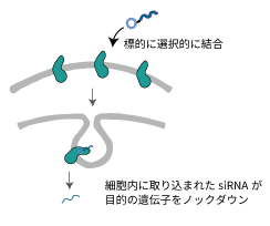 siRNAはRNAiという現象を利用した薬剤で、標的のmRNAを分解することで特定の遺伝子の発現を抑える短いRNAです。siRNAが遺伝子の発現量を減らす効果は「ノックダウン」と呼ばれ、高い効果と特異性があることが知られています。細胞内にある標的のRNAに結合してその作用を発揮するので、既存の低分子医薬品や抗体医薬では標的とすることが難しい(いわゆるundruggable)とされている標的にもアプローチできる治療法であることから、多くの製薬企業がこの核酸医薬品の研究開発に注力しています。siRNAは細胞内に入るとこのノックダウン効果を発揮するのですが、そのためには目的の組織に正確・効率的にデリバリーする必要があります。