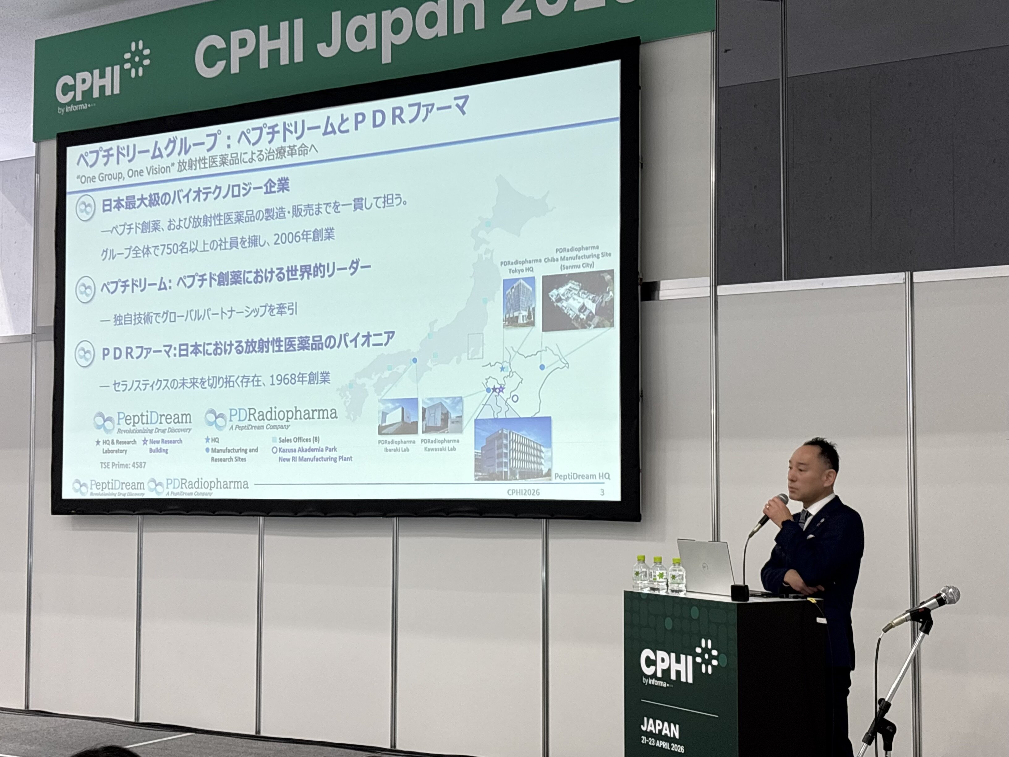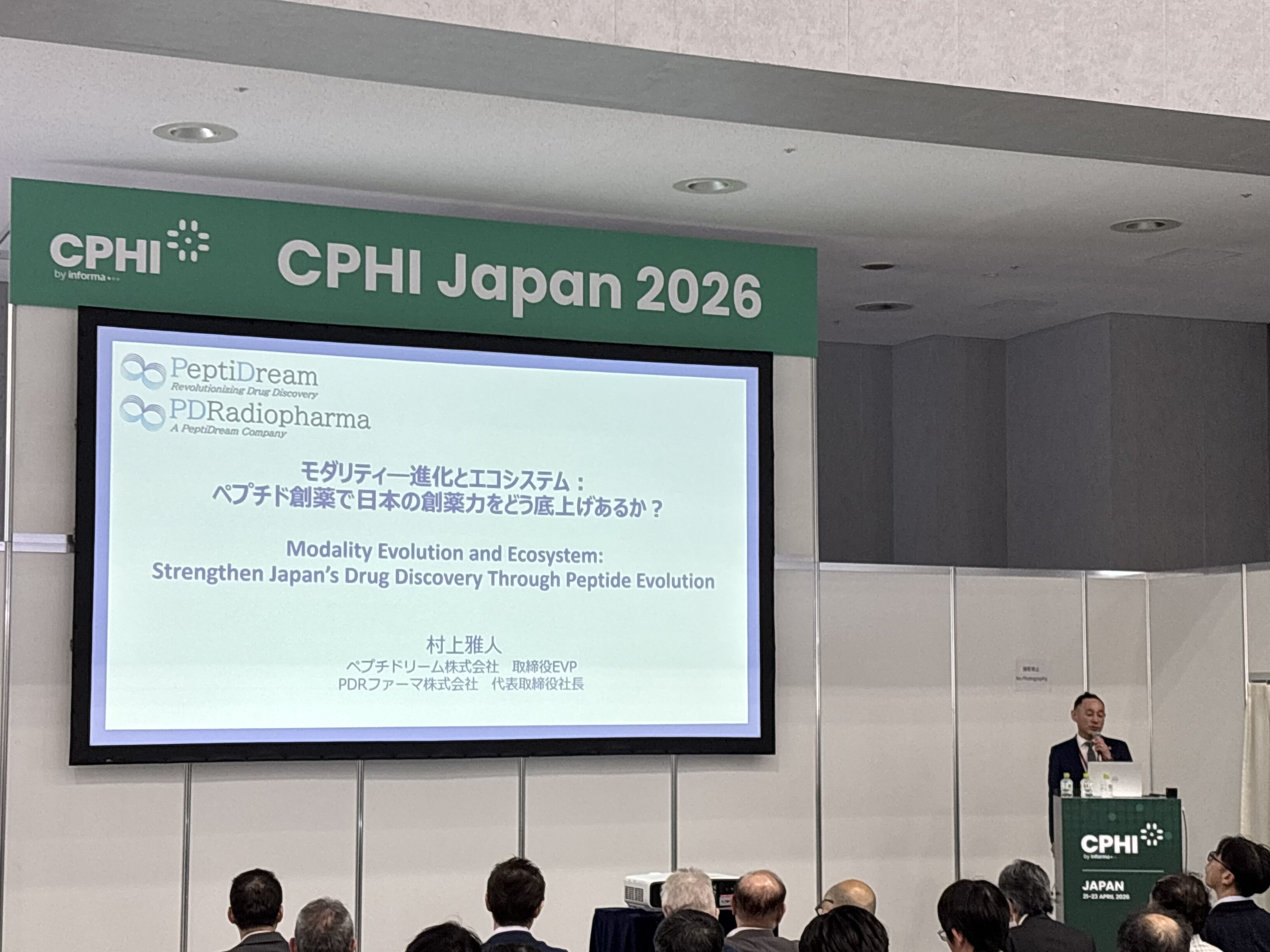 2026年4月21日(水)、CPHI Japan 2026の「創薬シンポジウム」にてセミナーを行い、80名以上の方にご参加いただきました。「モダリティ進化とエコシステム:ペプチド創薬で日本の創薬力をどう底上げするか」をテーマに、ペプチド創薬を軸に放射性医薬品によるセラノスティクスを含むモダリティ進化とエコシステムの観点から、日本の創薬力強化の方向性をお話しさせていただきました。ご参加いただいた皆様、誠にありがとうございました。